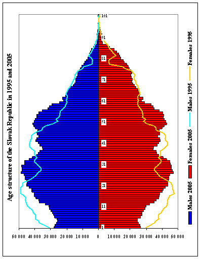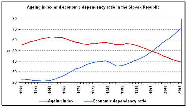 During 90s the demographic ageing of the Slovak population deepened. The number of older people in population increased (absolute ageing), as well as their share (relative ageing). The ageing of population was reflected in all indicators, by which it is possible to measure this phenomenon. Population started to age very remarkably mainly from the bottom part of the age pyramid due to still lower numbers of births, but the ageing appeared also from the top of the age pyramid, what is conditioned by the fact that still more people achieve the higher age. The demographic ageing of the Slovak population is documented also by the growth of mean values. The mean age in 2005 reached the level of 37.4 years what is historically the highest value in Slovakia. As compared to 1995, the Slovak population "has become older" by 2.87 years (increase by 8.3 %). Even better is the population ageing expressed by the ageing index. Currently more 70 persons aged 65 and over fall per 100 persons aged until 15 years. Due to the development at youngest and oldest age groups (accumulation of the effect of the low fertility and the prolongation of human life), the increase of ageing index is extremely dynamic. In comparison with 1995, the ageing index increased by 44 %. In 2005, approximately 23 people at the pre-reproductive age (0 - 14 years) and 16 people at the post-reproductive age (65 years and over), thus in total 39 non-productive people fell on 100 productive people. It was the lowest value of economic burden in last decade, which was caused by decreasing numbers of live births burden and by relatively low increase of the older population. The economic dependency ratio by young population represented 58.6 % and economic dependency ratio of old population represented 41.4 % of total economic burden in 2005. |